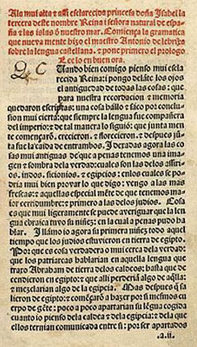 Ce este foarte interesant în Prefața acestei gramatici – gramatica dedicată reginei Isabel la católica – este faptul că Antonio Martínez de Cala, autorul ei, prevestea un mare viitor limbii spaniole: "siempre la lengua fue compañera del imperio" – întotdeauna limba a însoțit imperiul.