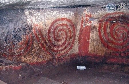 În Mormântul „Tablei de Șah”/Tomba della Scacchiera, din Bonovra, Sardinia de Nord-Vest, un mormânt neolitic cu trei nișe și enorme coarne de taur sculptate (3800 - 2900 î. Hr.) descoperit în 2008 (și, din păcate, sigilat de autoritățile sarde) există o serie de șapte spiralele roșii, fiecare cu diametrul de 70 cm, pictate într-o nișă laterală: