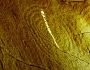 Calendarul solar de la Knowth, desen: spirala cea mare indică solstițiul de vară, iar spirala cea mică, pe cel de iarnă.