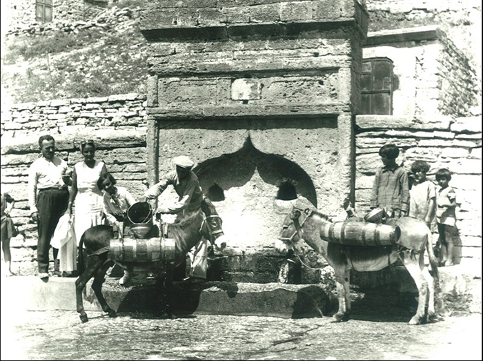 Măgarul şi sacaua, mijloc de transport al apei potabile în Cadrilater până la apariţia cişmelelor publice. Credit: https://imagoromaniae.ro