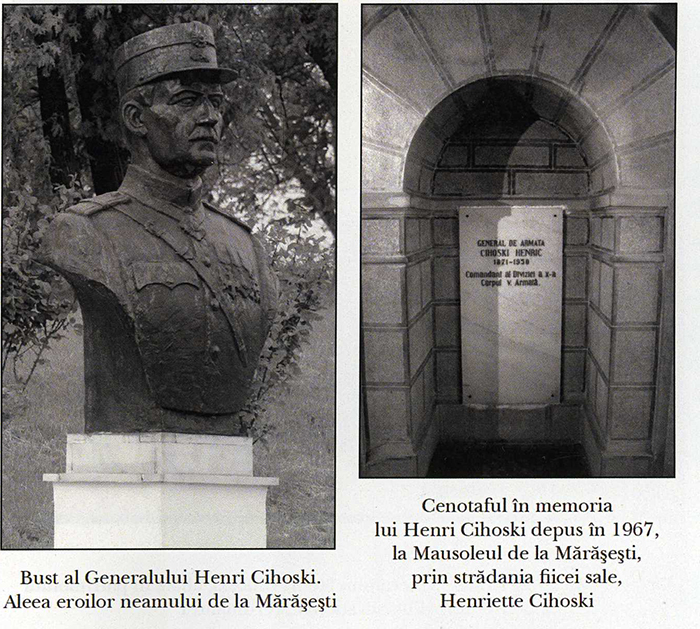 În amintirea marelui erou – generalul Henri Cihoschi, în anul 1967, cu prilejul comemorării a 50 de ani de la memorabilele lupte de la Mărășești, în urma nenumăratelor demersuri întreprinse de către fiica sa, Henriette Cihoschi, în incinta Mausoleului, în imediata apropiere a sarcofagului generalului Eremia Grigorescu, a fost așezată o placă funerară (cenotaf), iar în anul 1995, pe Aleea Eroilor i-a fost înălțat un bust din bronz. Astfel, sufletul Generalului se odihnește acum alături de vitejii săi camarazi.