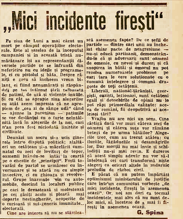 „S-au arestat delegaţii şi candidaţii, s-au furat urnele şi cărţile de alegători, s-au bătut mai ales, s-au schingiuit şi snopit sub lovituri de ciomege sute şi mii de alegători. (...) Am fost respins de la secţiile de votare cu baioneta în piept. Un colonel isteric ̶ Bolintineanu ̶ urla de dimineaţă:«daţi-i îndărăt, spargeţi capetele cu patul puştii!». La o secţie ̶ singura! ̶ delegaţii au pătruns în urma judecătorului. Au fost daţi afară de judecător şi de un căpitan de infanterie. Pretutindeni, jandarmii şi armata, comandaţi de bătăuşi, brutalizau, ameninţau şi împiedicau de la vot cetăţenii. Sub ochii mei se petreceau scene de barbarie, de vulgaritate, de laşitate abjectă. Părea o revoluţie a uniformelor militare şi administrative, o revoluţie a statului, prin organele sale conştiente şi inconştiente, împotriva cetăţeanului «civil». (...) La fiecare mişcare eram arestaţi şi trebuia să ne eliberăm cu forţa. La secţia de votare Ceamurlia suntem opriţi de soldaţi din cavalerie. Se încarcă în faţa noastră carabinele. Doi bătăuşi macedoneni, dintre care unul, un criminal cunoscut, comandau armata“.