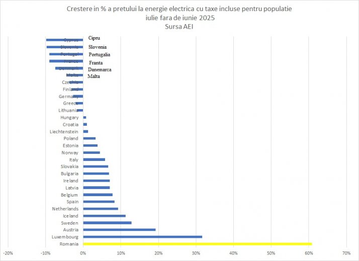 "Analizând prețurile energiei electrice cu toate taxele incluse în țările din UE, la consumatorul casnic în luna iulie 2025 constatăm că România ocupă locul 1 în rândul țărilor din Europa, raportat la puterea de cumpărare și are cea mai mare creștere a prețului energiei electrice din întreaga Europă între lunile iunie – iulie 2025, fiind mai mult decât dublă decât următoarea cea mai mare creștere de preț din Europa (România ocupă în luna iulie 2025, locul 10 la prețul energiei electrice pentru populație neraportat la puterea de cumpărare)", arată Asociația Energia Inteligentă.
