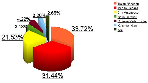Pe următoarele poziţii se situează Crin Antonescu - 20,78%, Cornelium Vadim Tudor - 5,39%,Kelemen Hunor - 4,57%, Sorin Oprescu - 3,38, George Becali - 1,85%, Remus Cernea - 0,64%, Constantin Rotaru - 0,42%, Eduard Manole - 0,37%, Ovidiu Iane - 0,24%, Constantin Potîrcă - 0,20 %.