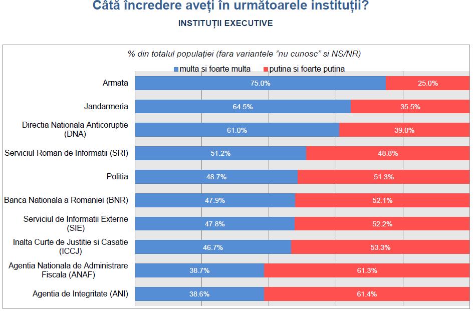Încrederea în armată, jandarmerie şi DNA este mare şi foarte mare, în proporţie de peste 60%, în rândul românilor, armata având chiar cel mai mare nivel de încredere al unei instituţii de75%.