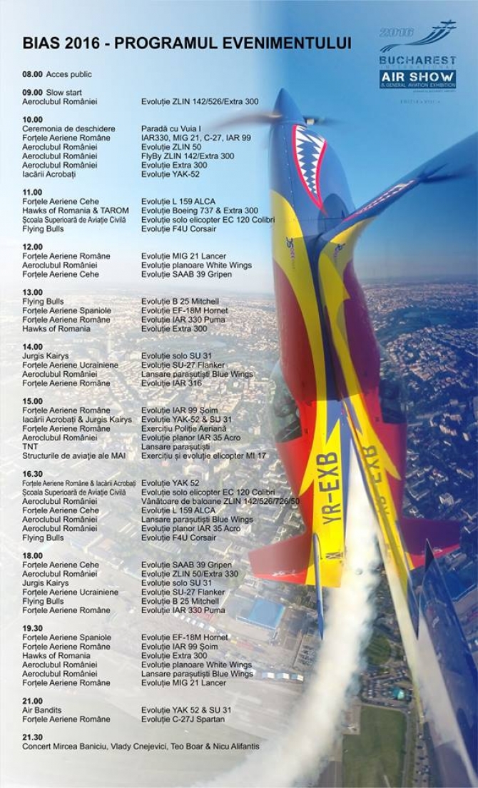 La BIAS 2016, vor participa piloti militari si civili din Romania, Spania, Ucraina, Cehia, SUA, Grecia, Austria, Bulgaria, Lituania, care ii vor incanta pe spectatori cu acrobatii aeriene si demonstratii de zbor profesionist.