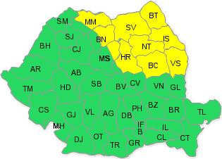 Atenţionarea cu cod galben vizează zece judeţe: Maramureş, Bistriţa-Năsăud, Mureş, Harghita, Suceava, Neamţ, Bacău, Botoşani, Iaşi, Valsui.