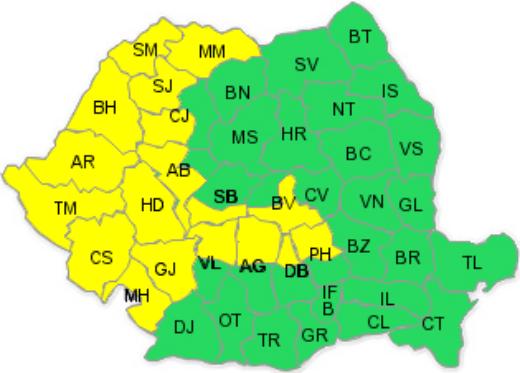 De la ora 17 până mâine dimineaţă, la ora 10, 18 judeţe din vest şi centru intră sub avertizare cod galben.