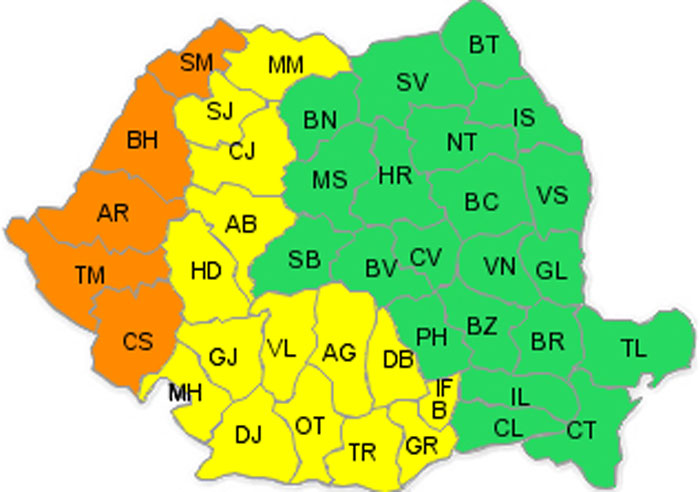Judeţele vizate de Codul galben sunt: Maramureş, Sălaj, Cluj, Alba, Hunedoara, Mehedinţi, Gorj, Vâlcea, Dolj, Olt, Argeş, Dâmboviţa, Teleorman, Giurgiu, Ilfov şi municipiul Bucureşti.