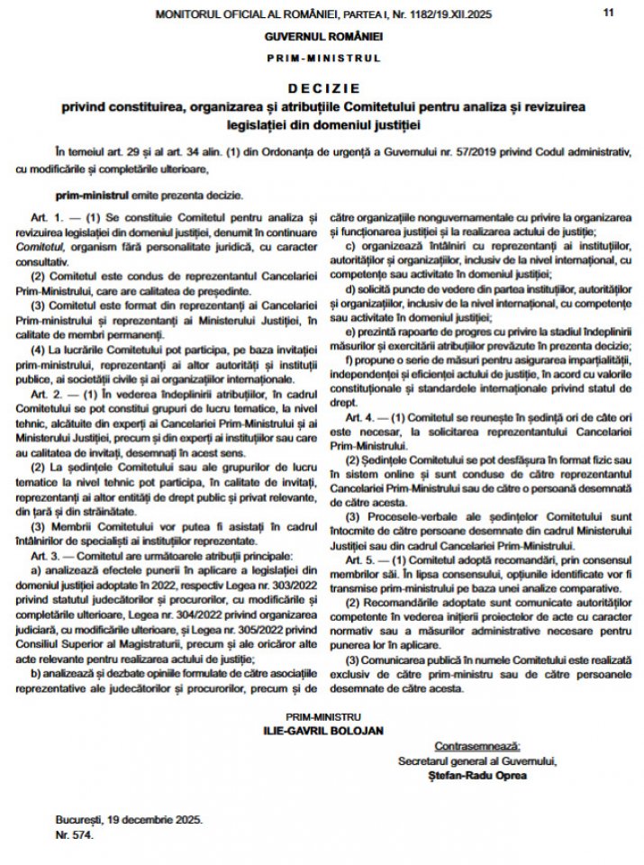 Decizia premierului privind constituirea "Comitetului pentru analiza și revizuirea legislației din domeniul Justiției" a fost publicată în Monitorul Oficial.
