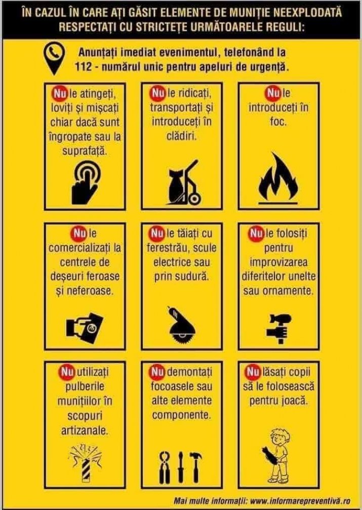 Pompierii reamintesc cetățenilor să nu atingă sau să miște obiectele ce par a fi elemente de muniție neexplodată și să anunțe imediat autoritățile.
