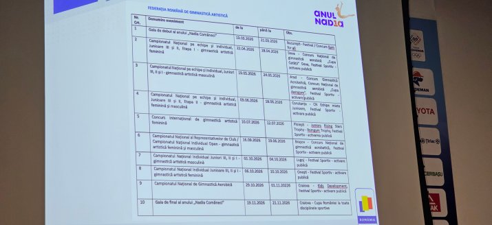 - martie 2026 - Gala de debut „Nadia Comăneci”. Primul eveniment major al anului competițional, organizat de Federația Română de Gimnastică, ocazie care marchează startul simbolic al anului dedicat gimnasticii românești;