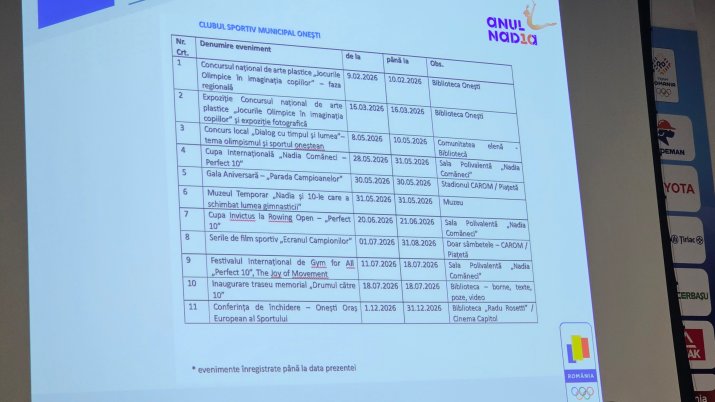„Onești este locul în care a început povestea Nadiei, leagănul gimnasticii românești, datorită regretatei doamne Maria Simionescu, cea care a creat prima școală de gimnastică feminină la Onești. Vor fi acțiuni direcționate, în primul rând, către copii, către mișcare, către incluziune socială, către artă, către cultură, către educație. Punctul central al anului 2026, la Onești, îl vor reprezenta două acțiuni: Parada Campioanelor - unde se va reuni, alături de simbolul nostru, Nadia Comăneci, toată lumea gimnasticii românești - și Cupa Internațională Nadia Comăneci”, a transmis directoarea CSM Onești, Ingrid Istrate.