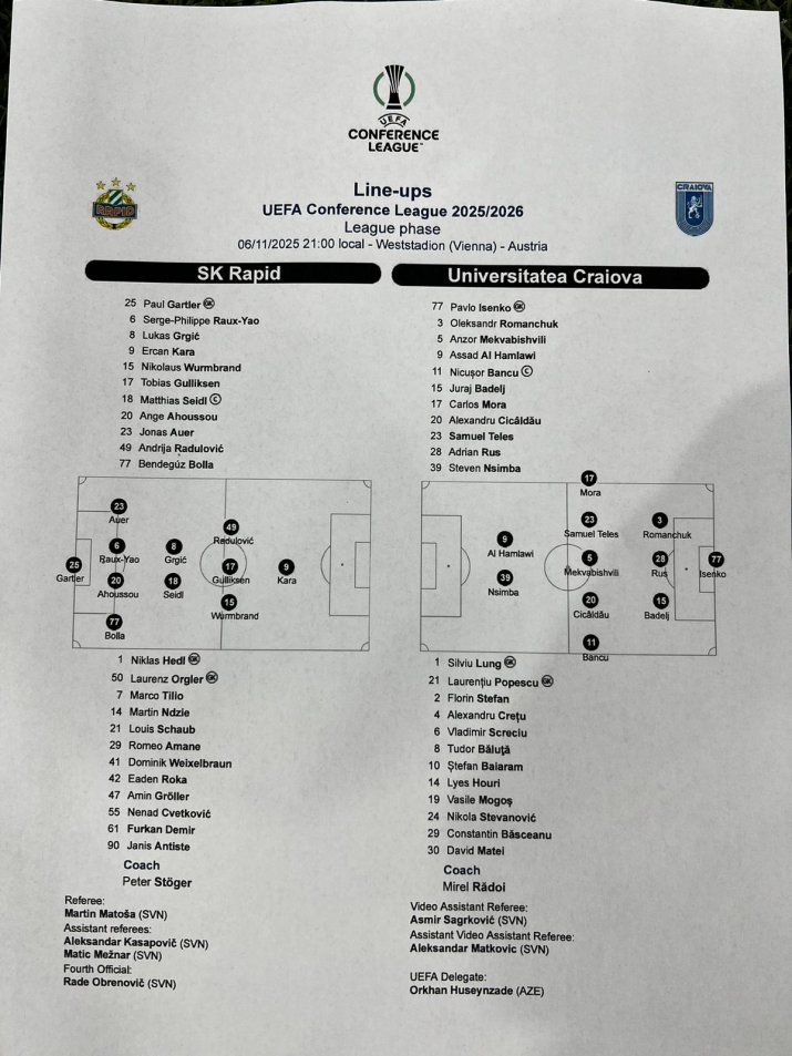 Univ Craiova țintește victoria cu Rapid Viena, în etapa a treia din grupa unică a Conference League. Meciul este transmis în direct la Radio România Actualități de Gabriel Liviu Balica.