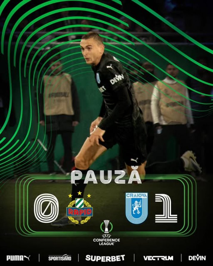 ⚽Min 37: GOOOOOOOOLLLLLLLL!!!! Univ Craiova o conduce cu 1-0 pe Rapid Viena.