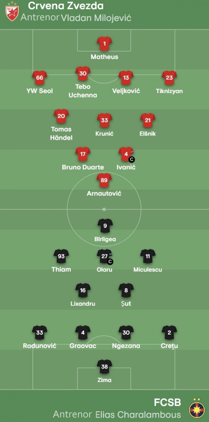 Steaua Roșie: Matheus - Seol, Uchenna, Veljkovic, Tiknizyan - Handel, Krunic, Elsnik - Duarte, Arnautovic, Ivanic