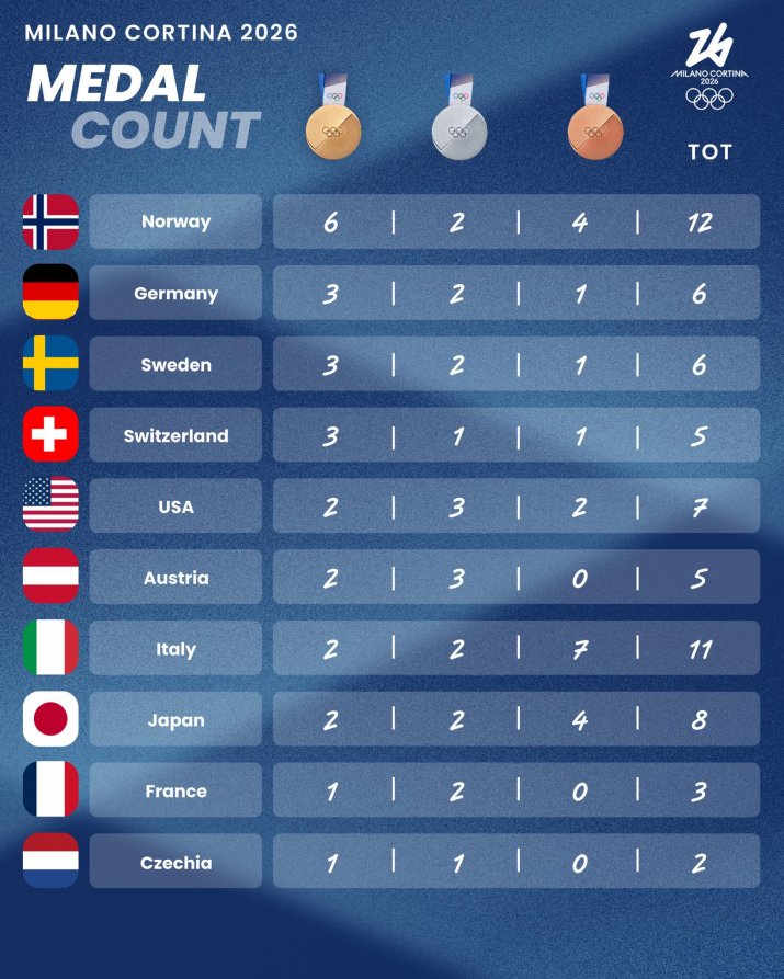 Norvegia domină Jocurile Olimpice de iarnă de la Milano și Cortina d'Ampezzo, cu 12 medalii, din care șase de aur. Germania și Suedia ocupă locul secund, în topul națiunilor, cu șase medalii fiecare, din care trei de aur.